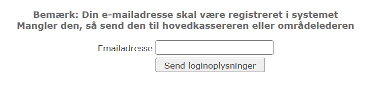 Herefter vil man få en ny formular hvor man skal angive sin mailadresse som også er kendt i medlemsdatabasen og tryk på ”send loginoplysninger”