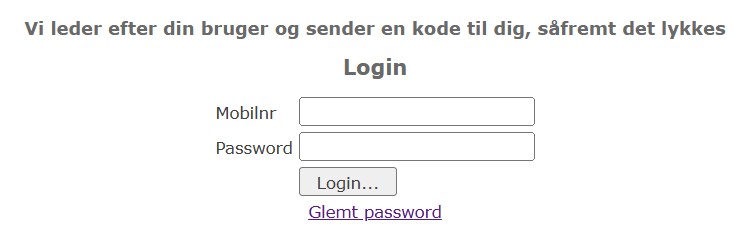 Hvorefter i udfylder med jeres eget mobilnummer kendt fra medlemsbasen og efterfølgende I trykker på Glemt Adgangskode.